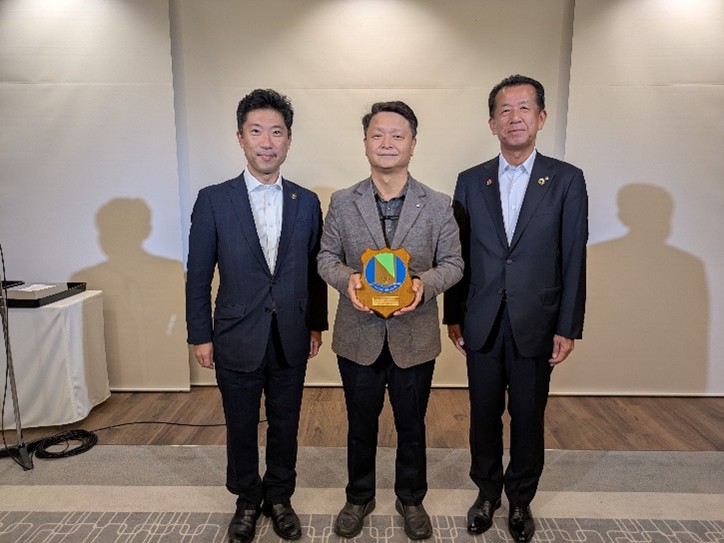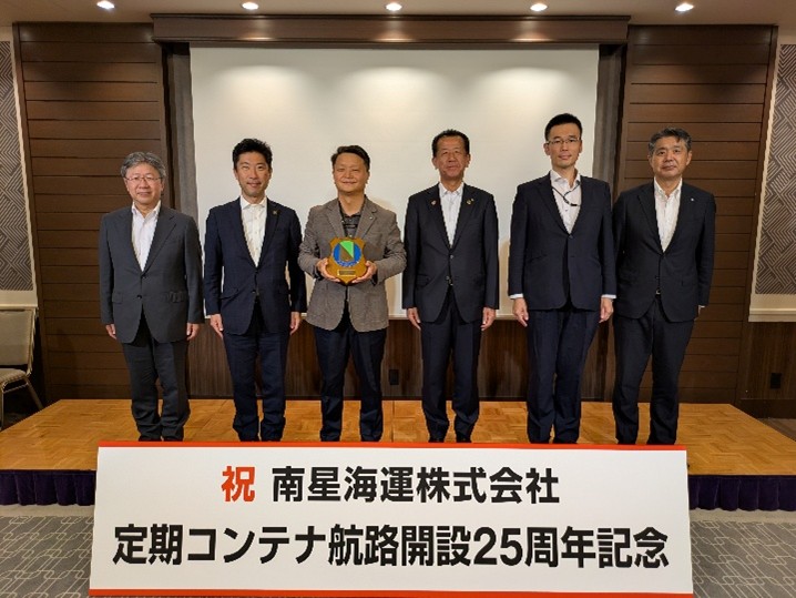南星海運 定期航路開設25周年記念式典を開催いたしました。 2025.10.14 お知らせ 南星海運殿による定期コンテナ航路が2000年に開設してから、本年で25周年を迎えたことを受け、10月14日(火)に記念セレモニーを開催いたしました。 当日は、これまでの長年の継続寄港・航路維持を感謝すべく、当協会(会長・副会長)より南星海運ジャパン殿(南星海運日本総代理店)に対し、記念品を贈呈させていただきました。 前のページに戻る